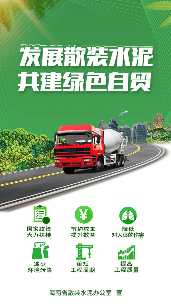 “在省委省政府的大力支持下,近年来海南省多个项目工地特别是自贸港建设重点工程都在积极使用预拌砂浆、预拌混凝土、装配式建筑等散装水泥绿色建材,这有效提高了我省水泥散装率,也为我省建筑业转型升级,实现低碳绿色发展起到了积极作用。”海南省散装水泥办公室负责人介绍:“接下来我办将加大对散装水泥、预拌混凝土、预拌砂浆的推广应用及监督管理,进一步提高散装水泥绿色产业在大型项目、乡村建设等方面的使用率,为促进节能减排、推动绿色发展、推进海南自由贸易港生态文明建设作出新贡献。”