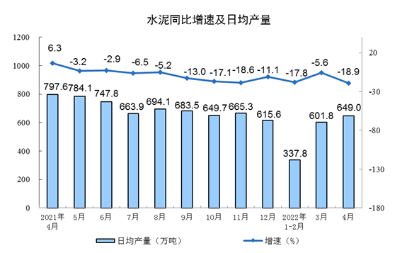 根据国家统计局数据显示,2022年1-4月份,全国累计水泥产量5.81亿吨,同比下降14.8%;全国固定资产投资(不含农户)153544亿元,同比增长6.8%;全国房地产开发投资39154亿元,同比下降2.7%。