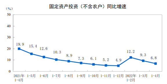 1—4月份,全国固定资产投资(不含农户)153544亿元,同比增长6.8%。其中,民间固定资产投资86872亿元,同比增长5.3%。从环比看,4月份固定资产投资(不含农户)下降0.82%。