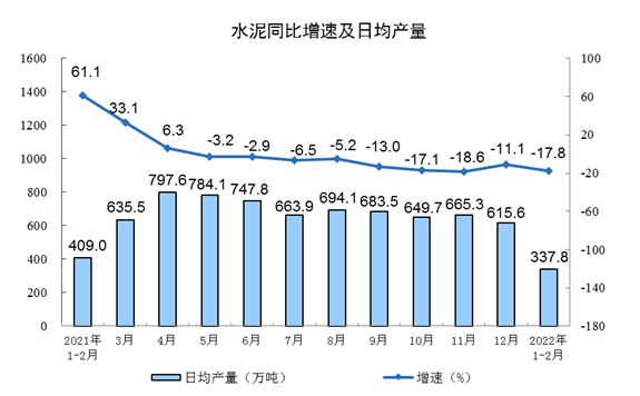 2022年1-2月份,全国累计水泥产量1.99亿吨,同比下降17.8%。