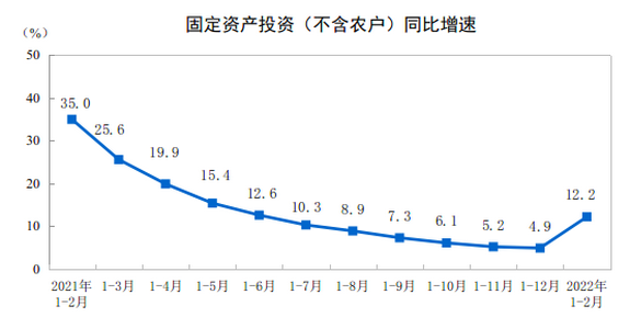 2022年1—2月份,全国固定资产投资(不含农户)50763亿元,同比增长12.2%。其中,民间固定资产投资29176亿元,同比增长11.4%。从环比看,2月份固定资产投资(不含农户)增长0.66%。