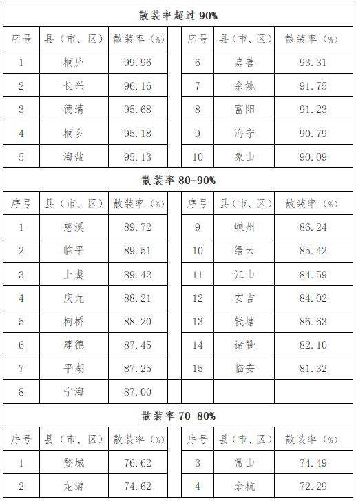 2021年,全省水泥散装率85.38%,同比提高1.32个百分点,超额完成水泥散装率84.50%的指导目标,继续位居全国各省区第二名。其中,列入散装率考核的8个设区市散装率依次为嘉兴93.83%、湖州93.64%、宁波90.11%、杭州89.02%、丽水85.27%、绍兴85.16%、衢州78.90%、金华70.81%;散装率同比提高依次为金华3.70个百分点、丽水3.69个百分点、湖州2.74个百分点、衢州2.13个百分点、嘉兴1.91个百分点、绍兴1.62个百分点、杭州1.10个百分点、宁波0.03个百分点。县(市、区)排名见下表: