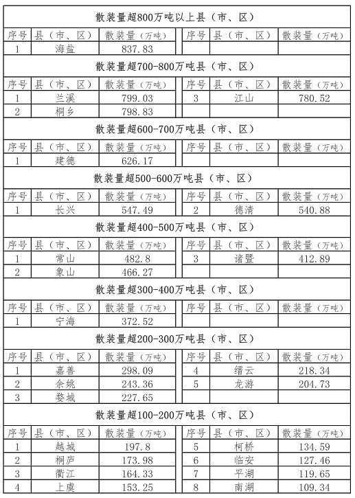 (2)散装量超千万吨的市和超百万吨的县(市、区)情况。列入散装量考核的8个设区市,除绍兴、丽水外,其余6市均超1000万吨,分别是嘉兴1899.07万吨、宁波1706.48万吨、衢州1541.79万吨、湖州1505.99万吨、杭州1503.89万吨、金华1156.21万吨。散装量同比增长率分别为:杭州19.77%、绍兴2.46%、丽水2.13%、嘉兴2.09%、宁波0.74%、金华-1.08%、湖州-2.26%、衢州-2.66%。县(市、区)排名见下表: