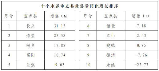 富阳、建德、余姚、海盐、桐乡、德 清、长兴、诸暨、兰溪、江山十个水泥重点县(市、区)水泥产量7038.97万吨,占全省总量51.69%,同比增加376.68万吨,增长5.65%;散装水泥供应量5335.47万吨,占全省总量45.89%,同比下降314.84万吨,负增长5.57%。详见下表: