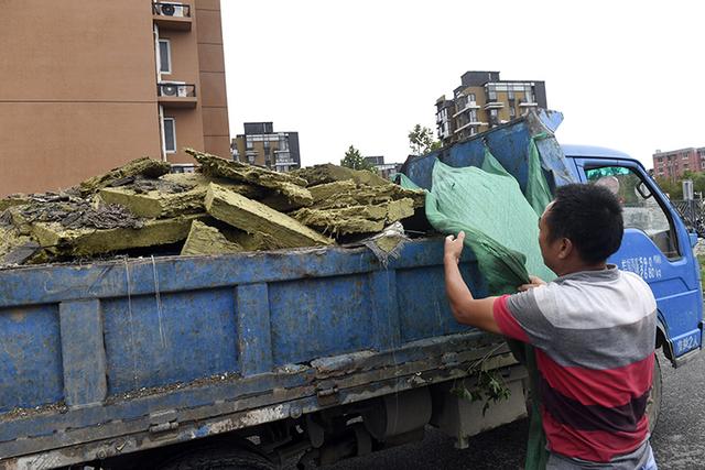 小区里,工人清理地面的墙皮和保温材料,用卡车运走。首开畅颐园物业公司称,他们会尽快对掉落墙皮的区域进行处理,防止二次掉落。