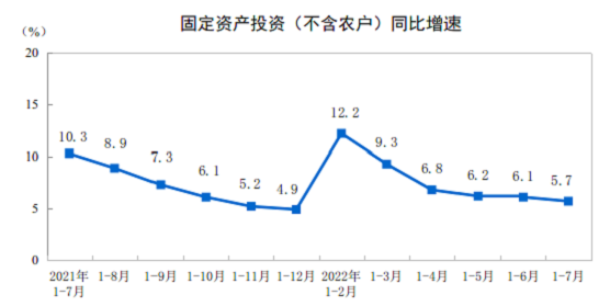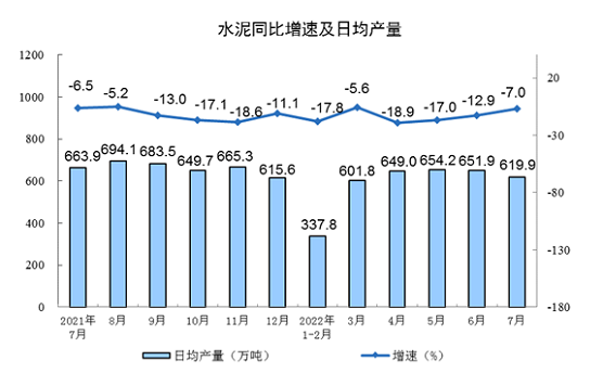 根据国家统计局数据显示,2022年1-7月,全国累计水泥产量116395万吨,同比下降14.2%;全国固定资产投资(不含农户)319812亿元,同比增长5.7%;全国房地产开发投资79462亿元,同比下降6.4%。