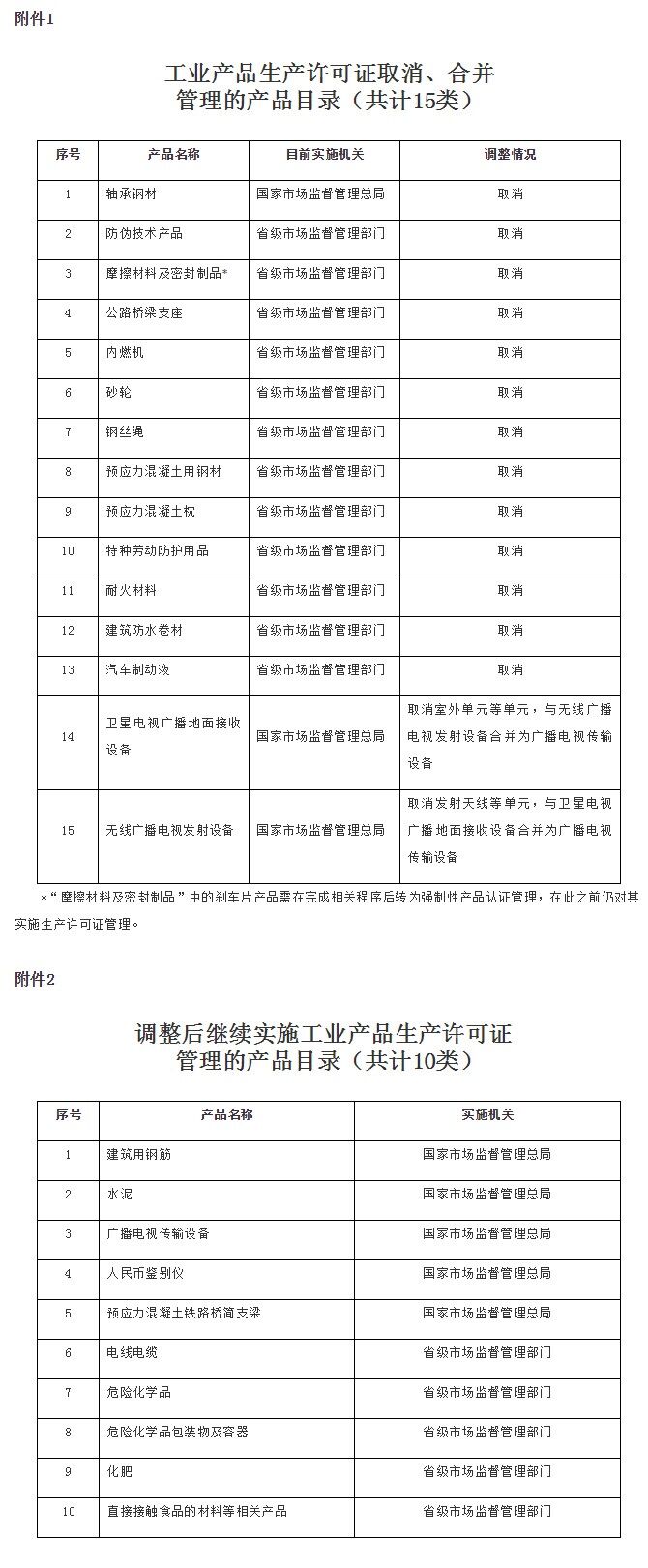 经研究论证,国务院决定,压减工业产品生产许可证管理目录,取消内燃机、汽车制动液等13类工业产品生产许可证管理,将卫星电视广播地面接收设备与无线广播电视发射设备2类产品压减合并为1类,对其中涉及安全、健康、环保的,转为强制性产品认证管理,认证费用由财政负担。调整后继续实施工业产品生产许可证管理的产品共计10类,其中,由国家市场监督管理总局实施的5类,由省级市场监督管理部门实施的5类。