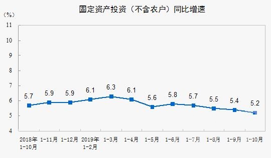2019年1-10月份,全国固定资产投资(不含农户)510880亿元,同比增长5.2%,增速比1-9月份回落0.2个百分点。从环比速度看,10月份固定资产投资(不含农户)增长0.40%。其中,民间固定资产投资291522亿元,同比增长4.4%,增速比1-9月份回落0.3个百分点。