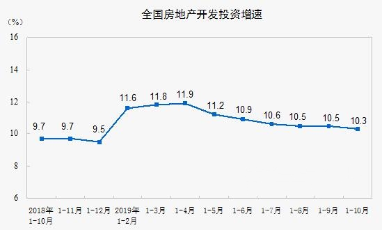 2019年1-10月份,全国房地产开发投资109603亿元,同比增长10.3%,增速比1-9月份回落0.2个百分点。其中,住宅投资80666亿元,增长14.6%,增速回落0.3个百分点。