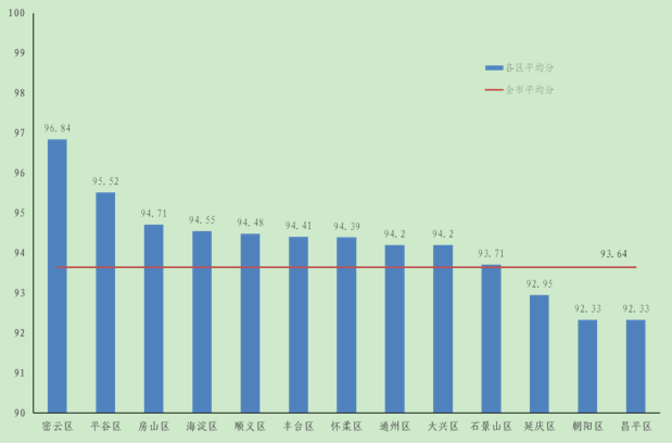 一季度评估覆盖全市13个辖区(各区平均得分排名详见图1)。排名前3名的为密云区、平谷区和房山区,延庆区、朝阳区以及昌平区平均得分低于全市平均分。延庆区已连续四个季度排名靠后,主要在生产信息平台管理和生产管理方面失分较多。(近4个季度各区平均得分排名见附件3)