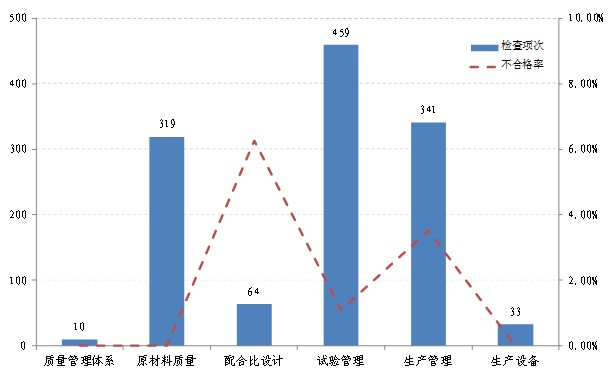 本季度专项检查共计检查预拌混凝土企业52家次。检查内容包括:预拌混凝土企业的质量管理体系、原材料管理、配合比设计、试验管理、生产管理、生产设备等方面,共计检查1226项次,合格率为98.3%,其中不合格项主要出现在配合比设计、试验管理以及生产管理方面(具体情况见图1)。在现场执法检查的同时对预拌混凝土试块(拌合物)、原材料进行监督抽测,共计抽测混凝土试块(拌合物)109组,抽检试块均达到设计强度的100%;抽检原材料53组,合格53组,合格率为100%。
