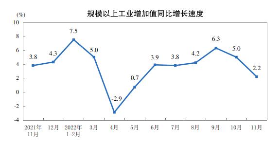 12月15日,国家统计局发布11月份经济数据。11月份,规模以上工业增加值同比实际增长2.2%(增加值增速均为扣除价格因素的实际增长率)。从环比看,11月份,规模以上工业增加值比上月下降0.31%。1—11月份,规模以上工业增加值同比增长3.8%。