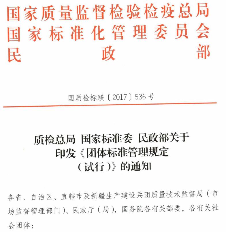 2017年11月4日,《中华人民共和国标准化法》已经第十二届全国人民代表大会常务委员会第三十次会议修订通过,依据新修订的《中华人民共和国标准化法》,质检总局、国家标准委、民政部制定了《团体标准管理规定(试行)》,并经国务院标准化协调推进部际联席会议第四次全体会议审议通过,于2017年12月15日印发。