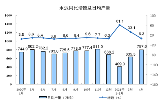 2021年1-4月份,全国累计水泥产量6.8亿吨,同比增长30.1%。4月份,全国单月水泥产量2.39亿吨,同比增长6.3%。