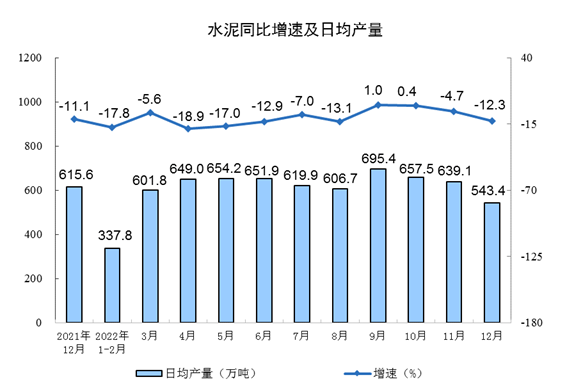 2022年12月份,水泥产量16844万吨,同比下降12.3%;1-12月份,水泥产量211795万吨,同比下降10.8%。