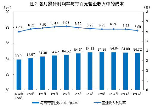 2022年,规模以上工业企业实现营业收入137.91万亿元,比上年增长5.9%;发生营业成本116.84万亿元,增长7.1%;营业收入利润率为6.09%,比上年下降0.64个百分点。