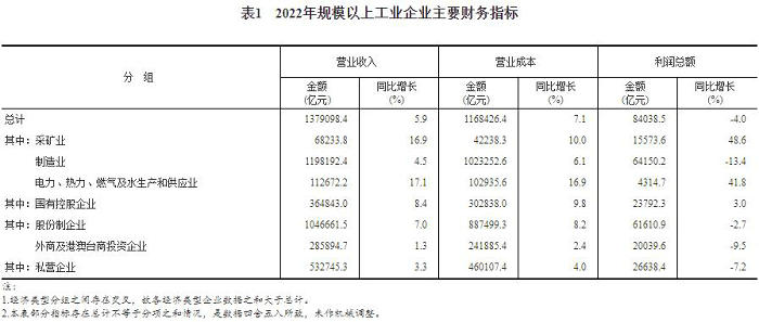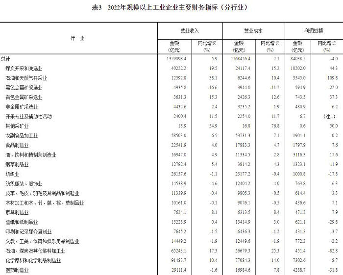 2022年,全国规模以上工业企业实现利润总额84038.5亿元,比上年下降4.0%(按可比口径计算,详见附注二)。