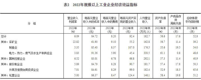 2022年末,规模以上工业企业每百元资产实现的营业收入为92.4元,比上年减少2.9元;人均营业收入为182.7万元,比上年增加13.4万元;产成品存货周转天数为17.6天,比上年增加0.9天;应收账款平均回收期为52.8天,比上年增加3.5天。
