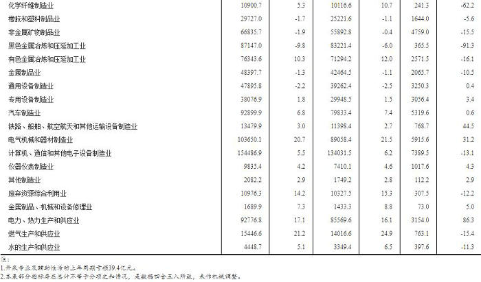 二、规模以上工业企业利润总额、营业收入等指标的增速均按可比口径计算。报告期数据与上年所公布的同指标数据之间有不可比因素,不能直接相比计算增速。其主要原因是:(一)根据统计制度,每年定期对规模以上工业企业调查范围进行调整。每年有部分企业达到规模标准纳入调查范围,也有部分企业因规模变小而退出调查范围,还有新建投产企业、破产、注(吊)销企业等变化。(二)加强统计执法,对统计执法检查中发现的不符合规模以上工业统计要求的企业进行了清理,对相关基数依规进行了修正。(三)加强数据质量管理,剔除跨地区、跨行业重复统计数据。