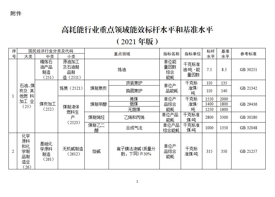 附件:高耗能行业重点领域能效标杆水平和基准水平(2021年版)