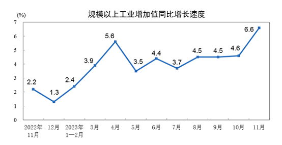 11月份,规模以上工业增加值同比实际增长6.6%(增加值增速均为扣除价格因素的实际增长率)。从环比看,11月份,规模以上工业增加值比上月增长0.87%。1—11月份,规模以上工业增加值同比增长4.3%。