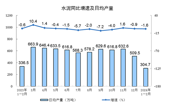1—2月份,全国水泥产量18280万吨,同比下降1.6%。