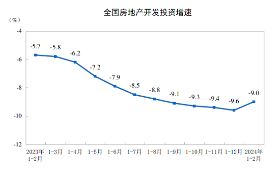 1—2月份,全国房地产开发投资11842亿元,同比下降9.0%;其中,住宅投资8823亿元,下降9.7%。1—2月份,房地产开发企业房屋施工面积666902万平方米,同比下降11.0%。其中,住宅施工面积466636万平方米,下降11.4%。房屋新开工面积9429万平方米,下降29.7%。其中,住宅新开工面积6796万平方米,下降30.6%。房屋竣工面积10395万平方米,下降20.2%。其中,住宅竣工面积7694万平方米,下降20.2%。