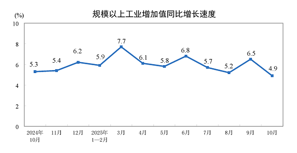 一、2025年10月份规模以上工业增加值增长4.9%