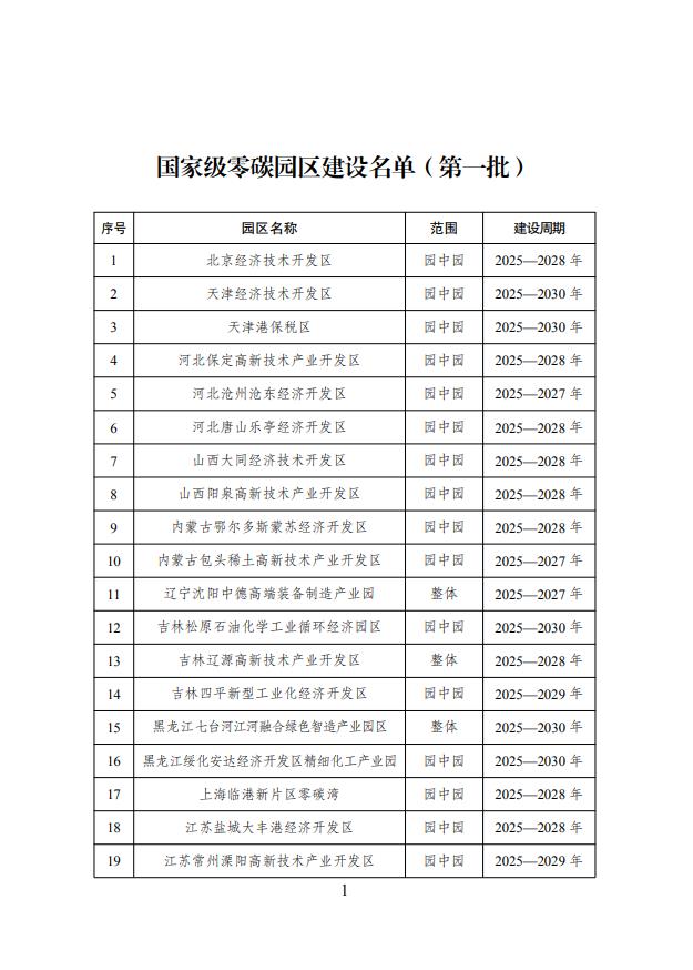 按照《国家发展改革委 工业和信息化部 国家能源局关于开展零碳园区建设的通知》(发改环资〔2025〕910号)要求,经园区申报、地方推荐、专家评审、部门会商等程序,确定了国家级零碳园区建设名单(第一批),共纳入52个园区。现予公布,并就有关事项通知如下:
