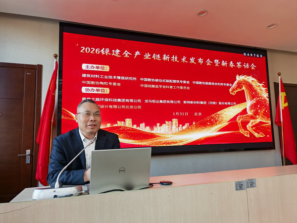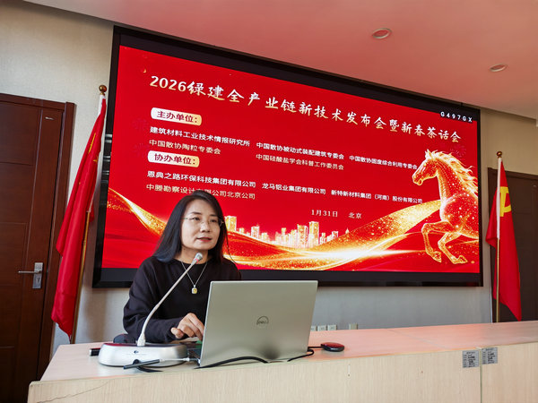 2026年1月31日由建筑材料工业技术情报研究所、中国散装水泥推广发展协会固废综合利用专业委员会((以下简称“中国散协固废综合利用专委会”))、中国散协被动式装配建筑专委会、中国散协陶粒专委会、中国硅酸盐学会科普工作委员会共同主办,青岛恩典之路环保有限公司、龙马铝业集团有限公司、新特新材料集团(河南)股份有限公司、中塍勘察设计有限公司北京公司等单位协办的“2026绿建全产业链新技术发布会暨新春茶话会在北京召开”。