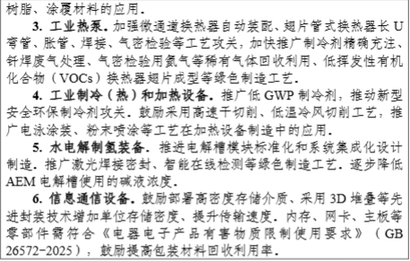(七)加强产品绿色低碳设计和制造。推广绿色低碳设计理念,推动节能装备全生命周期绿色低碳设计。加强轻量化设计,优先使用可回收材料,提高绿色低碳物料使用率,从源头减少原生材料使用,降低产品碳足迹。面向铸造、机加工、焊接、涂装、热处理、电镀等环节,推广精密铸造、增材制造、近净成形、激光表面改性、干式切削、低温等离子清洗、纳米复合电刷镀、热喷涂、微弧氧化等绿色工艺技术,提升绿色制造水平。