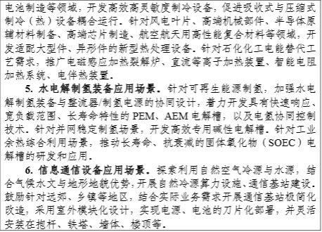 (十)强化装备与场景间耦合匹配。面向重点用能行业、新兴产业的发展需求,开发场景适配的关键节能装备和一体化系统解决方案。针对可再生能源发电、新能源汽车、大规模氢气制取和储运、航空航天、生物医药、二氧化碳捕集与封存等新兴应用场景,开发专用节能装备。针对自然冷源、风光资源丰富地区,鼓励建设自然冷却系统、可再生能源发电等,提升信息通信基础设施绿色发展水平。针对热力系统低碳、零碳需求,突破长距离低成本输热、跨季节大规模储热和热电协同等技术,支撑电力系统削峰填谷和绿电消纳。