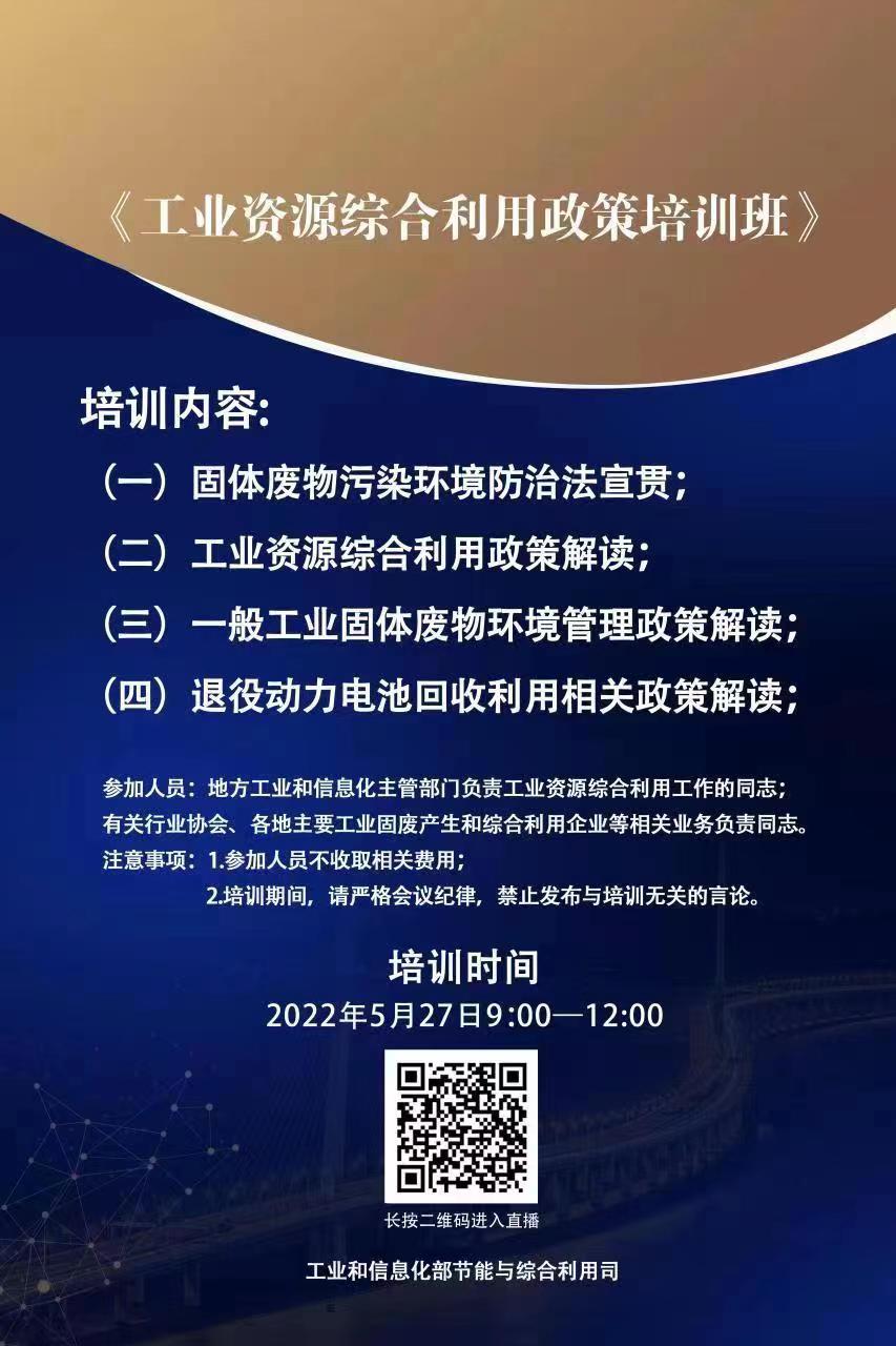 为贯彻落实《固体废物污染环境防治法》,深入推进工业资源综合利用,推进工业绿色发展,工业和信息化部节能与综合利用司定于2022年5月27日举办工业资源综合利用政策培训班(免费)。我协会协助组织会员单位及行业相关企业参加会议。