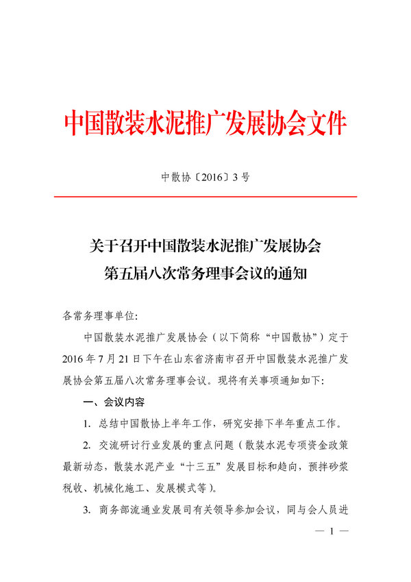 关于召开中国散装水泥推广发展协会第五届八次常务理事会议的通知
