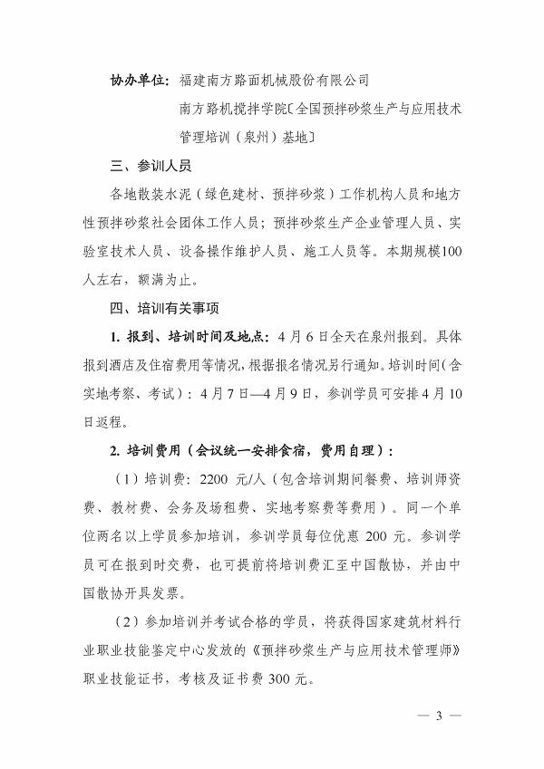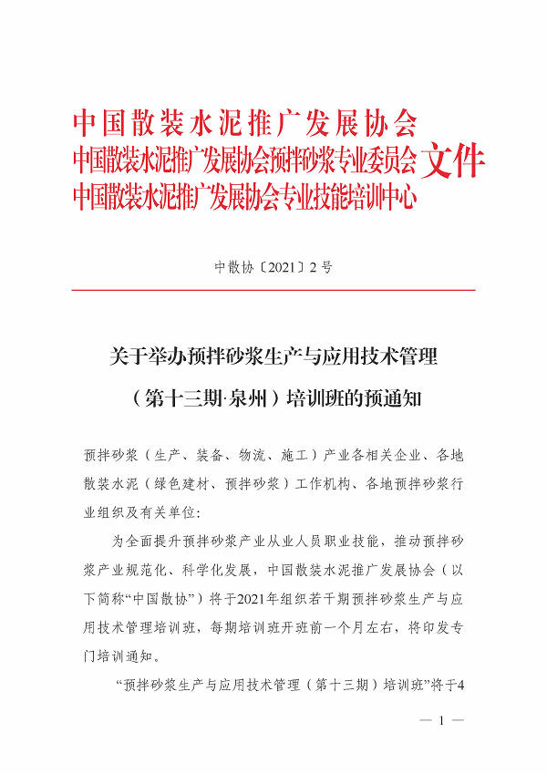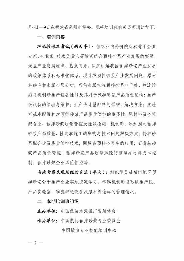 关于举办预拌砂浆生产与应用技术管理(第十三期 泉州)培训班的预通知