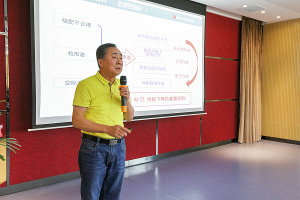 中国散协副理事长、中国散协预拌砂浆专业委员会副主任、中国散协预拌砂浆专业委员会/装备技术专业委员会专家咨询委员会委员、山东方达康工业纤维素有限公司总经理、中国散协预拌砂浆专业委员会与山东方达康工业纤维素有限公司共建的“砂浆技术研究院”院长冯文利深入讲解了预拌砂浆原材料配合比,天然砂、机制砂、添加剂分别对砂浆产品质量、性能及施工中的影响以及相应的解决方案,特种砂浆技术要点,固废在预拌砂浆中的应用技术及质量管控,石膏基砂浆质量管控和应用技术要点等。在理论授课之前,冯文利总经理以南方路机生产的机制砂为砂石原料,现场调配抹灰砂浆和机喷砂浆,这一创新型授课模式,获得了学员的广泛欢迎。调配现场,学员与冯总互动交流,热烈地讨论相关技术要点。