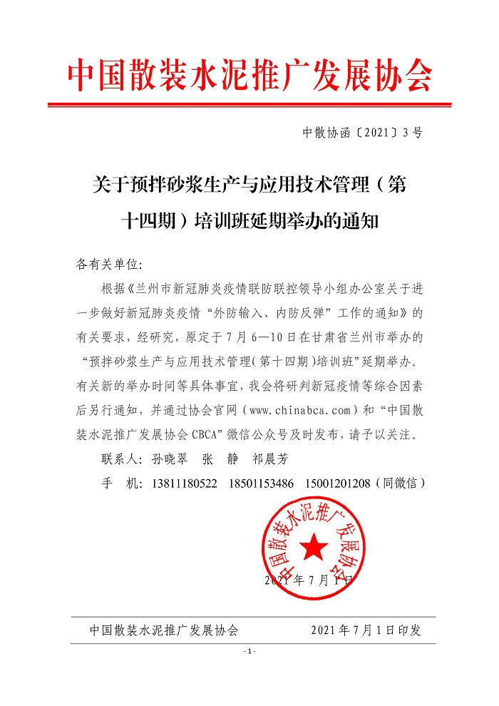 关于预拌砂浆生产与应用技术管理(第十四期·兰州)培训班延期举办的通知