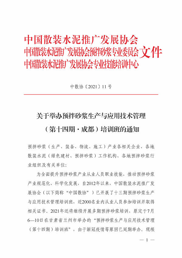 关于举办预拌砂浆生产与应用技术管理(第十四期·成都)培训班的通知
