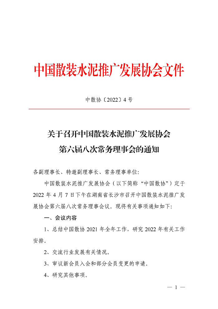 关于召开中国散装水泥推广发展协会第六届八次常务理事会的通知