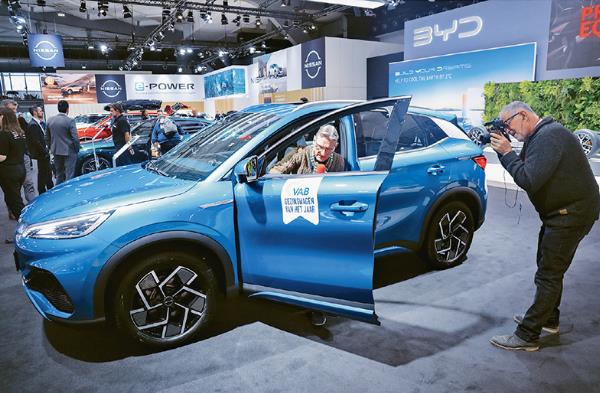 2023年1月13日,第100届比利时布鲁塞尔车展迎来媒体开放日,这是该展览疫情后首次线下举办。比亚迪、上汽、北汽、东风小康、赛力斯等中国品牌携高端车型登陆车展,其中多款电动汽车备受瞩目。图为记者在比利时布鲁塞尔车展媒体开放日上报道比亚迪Atto3电动汽车。
