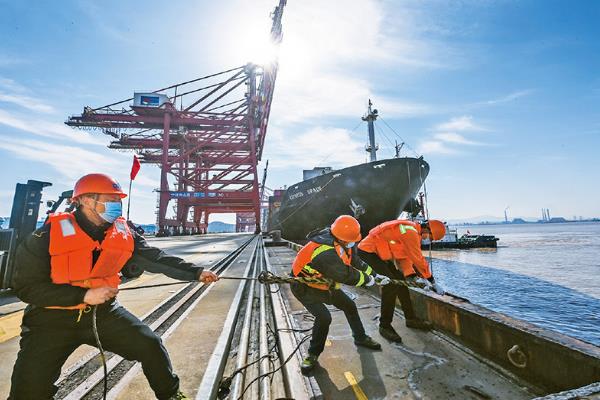 农历新年伊始,众多行业迅速投入生产,为经济运行持续攀升,实现开门稳、开门好、开门红、开门旺奠定坚实基础。图为2023年1月31日,在宁波舟山港金塘港区大浦口集装箱码头上,工作人员合力拉缆绳,帮助一艘外籍货轮靠泊。