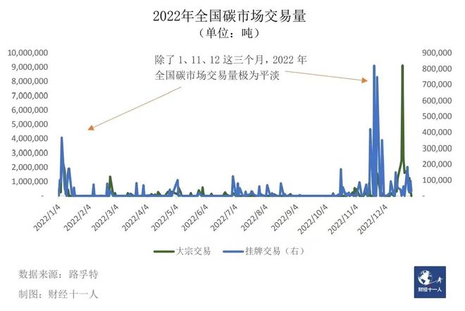 因此,全国碳市场配额交易从2022年11月开始增多。11月和12月的全国碳市配额交易量占2022年全年交易总量的三分之二。11月的交易量为730万吨,12月为2625万吨,超过1-11月份交易量总和。