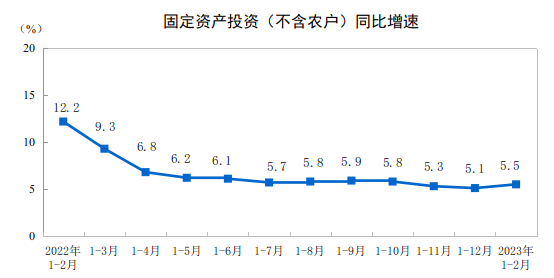 1—2月份,全国固定资产投资(不含农户)53577亿元,同比增长5.5%。其中,民间固定资产投资29420亿元,同比增长0.8%。从环比看,2月份固定资产投资(不含农户)增长0.72%。