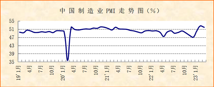中国物流与采购联合会、国家统计局服务业调查中心发布的2023年3月份中国制造业采购经理指数(PMI)为51.9%,较上月下降0.7个百分点,仍位于52%左右较好水平。指数连续3个月运行在扩张区间,显示经济继续保持平稳较快回升。分项指数变化显示,市场需求平稳较快增长,生产活动稳定恢复,大中小型企业经营活动稳中有增,企业成本趋于下降。