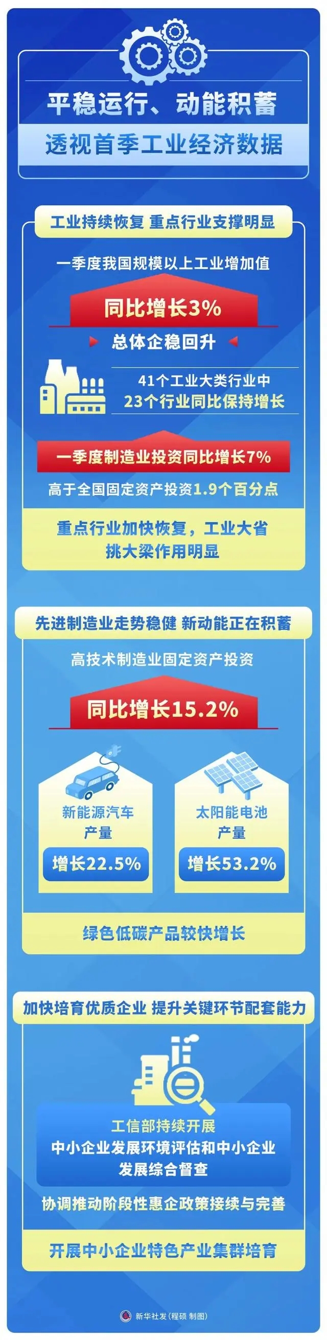 工业是经济发展的“压舱石”,全力促进工业经济平稳增长,对做好今年经济工作十分关键。数据显示,一季度我国规模以上工业增加值同比增长3%,总体企稳回升。41个工业大类行业中,23个行业同比保持增长。