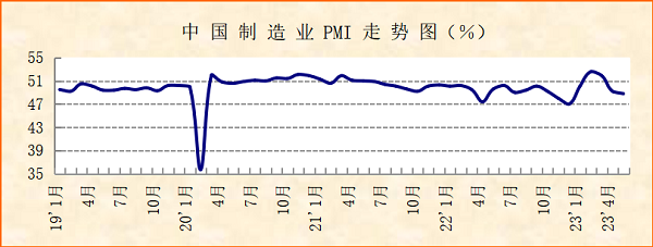 中国物流与采购联合会、国家统计局服务业调查中心发布的2023年5月份中国制造业采购经理指数(PMI)为48.8%,较上月下降0.4个百分点,连续2个月运行在50%以下。分项指数变化显示,经济恢复动能有所不足,企业生产活动放缓,市场价格持续下降,传统行业加快下行,新动能趋稳回升,新旧动能加快转换。