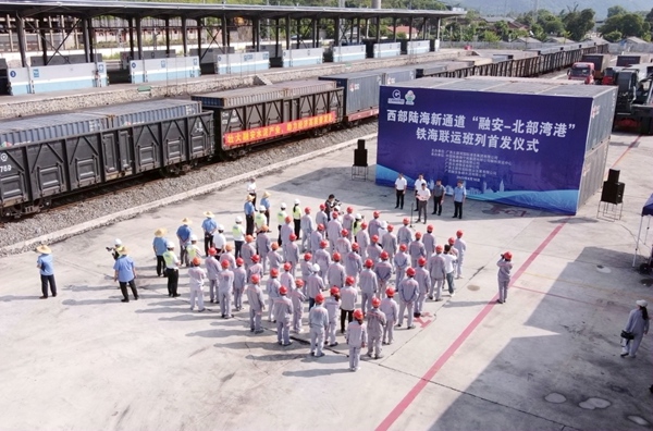 8月16日下午,装载40标箱1180吨水泥熟料的班列从广西融安县浮石站出发,将经由钦州港东站出海运往华南沿海地区助力基础建设。这是广西融安开出的首趟西部陆海新通道铁海联运班列,西部陆海新通道再增添一条新路线。
