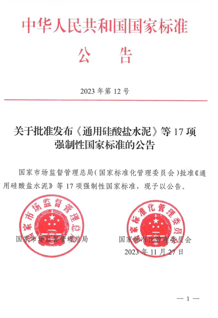 国家市场监督管理总局(国家标准化管理委员会)批准《通用硅酸盐水泥》等 17 项强制性国家标准,现予以公告。