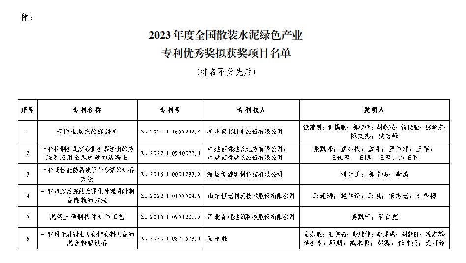 根据中国散装水泥推广发展协会《关于申报2023年度全国散装水泥绿色产业专利优秀奖的通知》(中散协〔2023〕5号)要求,经各地散装水泥工作机构推荐、各会员企业申报、专家组评审等规定程序,拟确定“带抑尘系统的卸船机”(ZL 2021 1 1657242.4)等6项专利(名单附后)为“2023年度全国散装水泥绿色产业专利优秀奖”,现予公示。公示期为5日,即2023年12月11日至2020年12月15日。公示期间如对拟获奖项目有异议,请与我会秘书处联系。