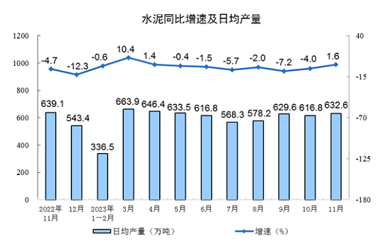 二、2023年1-11月全国水泥产量186735万吨,同比下降0.9%